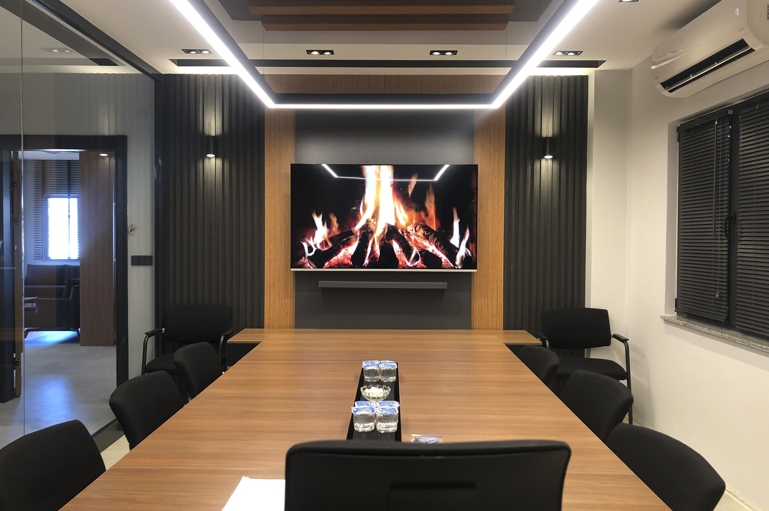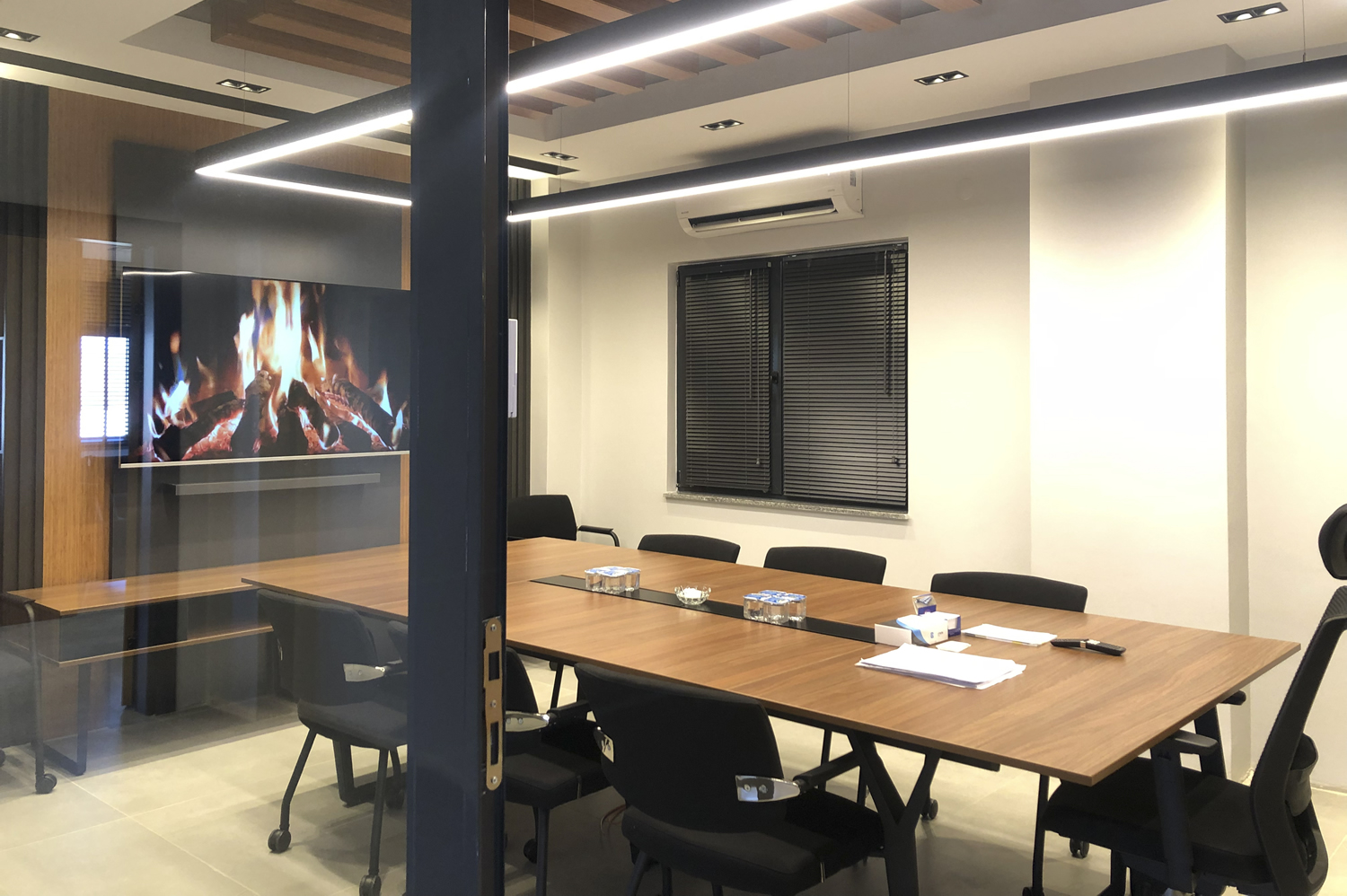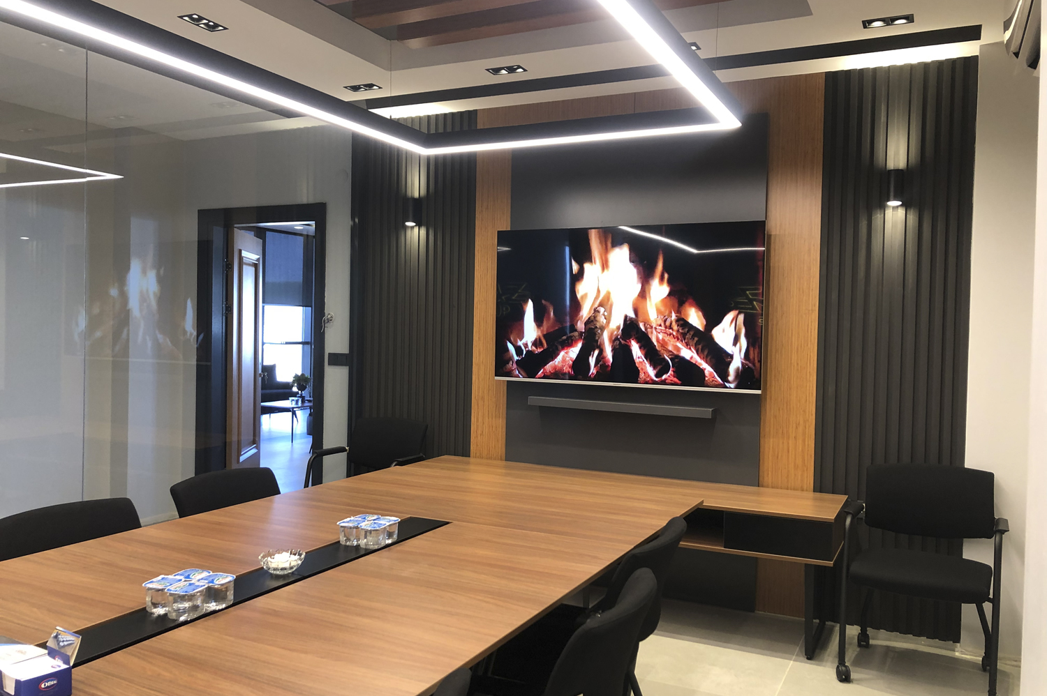 Toplantı odası, hem yönetim ekibi hem de misafir katılımcılar için konforlu, düzenli ve odaklanmayı kolaylaştıran bir alan olarak planlanmıştır. Masaların konumu, oturma düzeni ve tamamlayıcı mobilya elemanları, toplantı dinamiklerini destekleyecek şekilde profesyonelce yerleştirilmiş; yerleşim sırasında görsel bütünlük ve mekansal denge ön planda tutulmuştur. Tüm uygulama süreci boyunca kusursuzluk hedeflenmiş, her ayrıntı deneyimli ekibimiz tarafından kontrol edilerek en yüksek kalitede tamamlanmıştır.