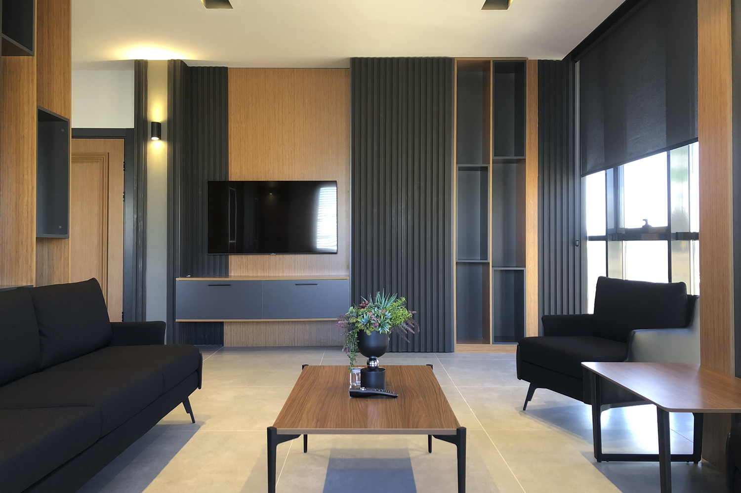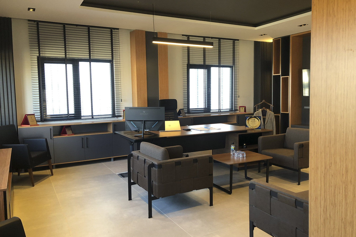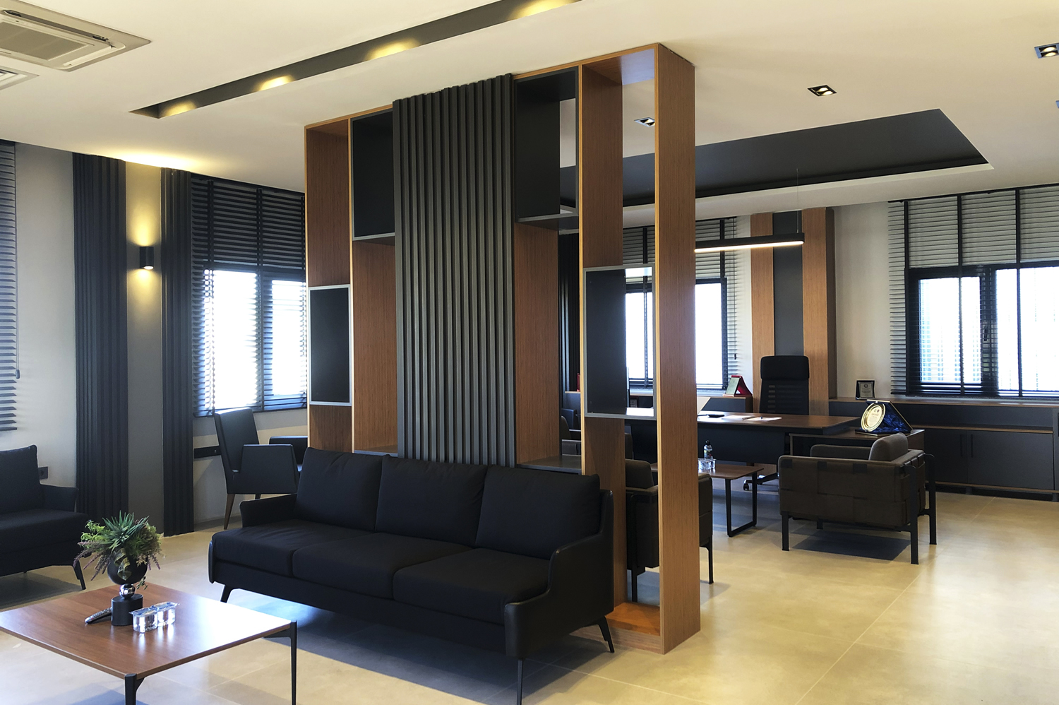 Yönetici odasında, yöneticinin çalışma alışkanlıkları ve mekanın temsil ettiği kurumsal kimlik göz önünde bulundurularak özel bir planlama yapılmıştır. Mobilya yerleşimi, alanın ergonomisini en verimli şekilde kullanacak biçimde tasarlanmış; hem çalışma alanı hem de misafir ağırlama bölümü arasında kusursuz bir denge kurulmuştur. Detaylara verilen önem ve uygulama sürecindeki titizlik, odanın genel atmosferinde kendini hissettirmekte, sade ama güçlü bir etki yaratmaktadır.