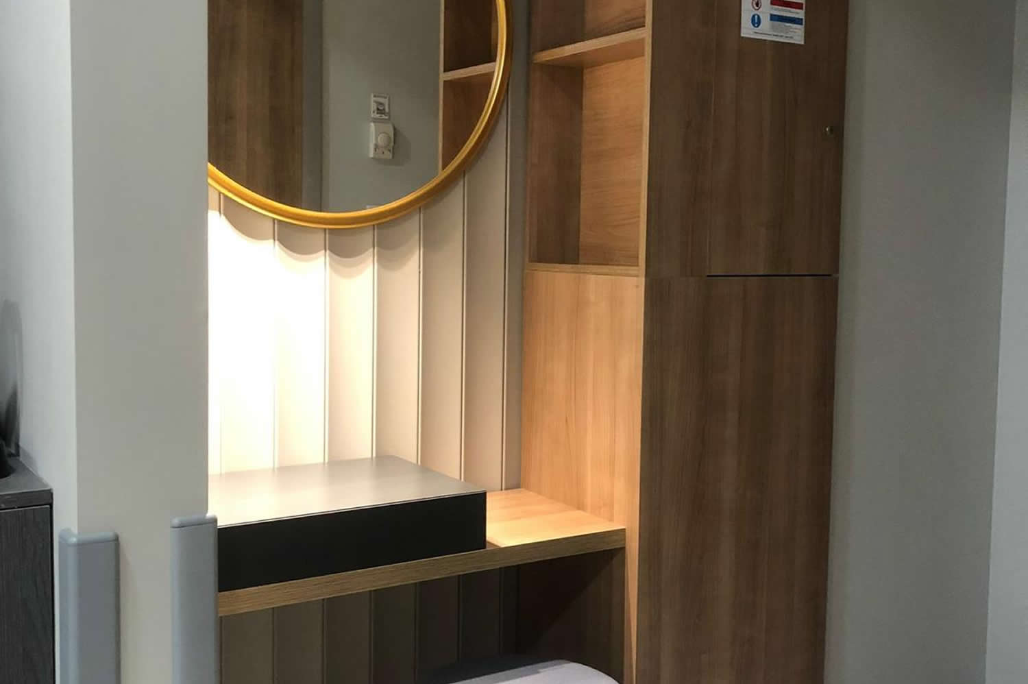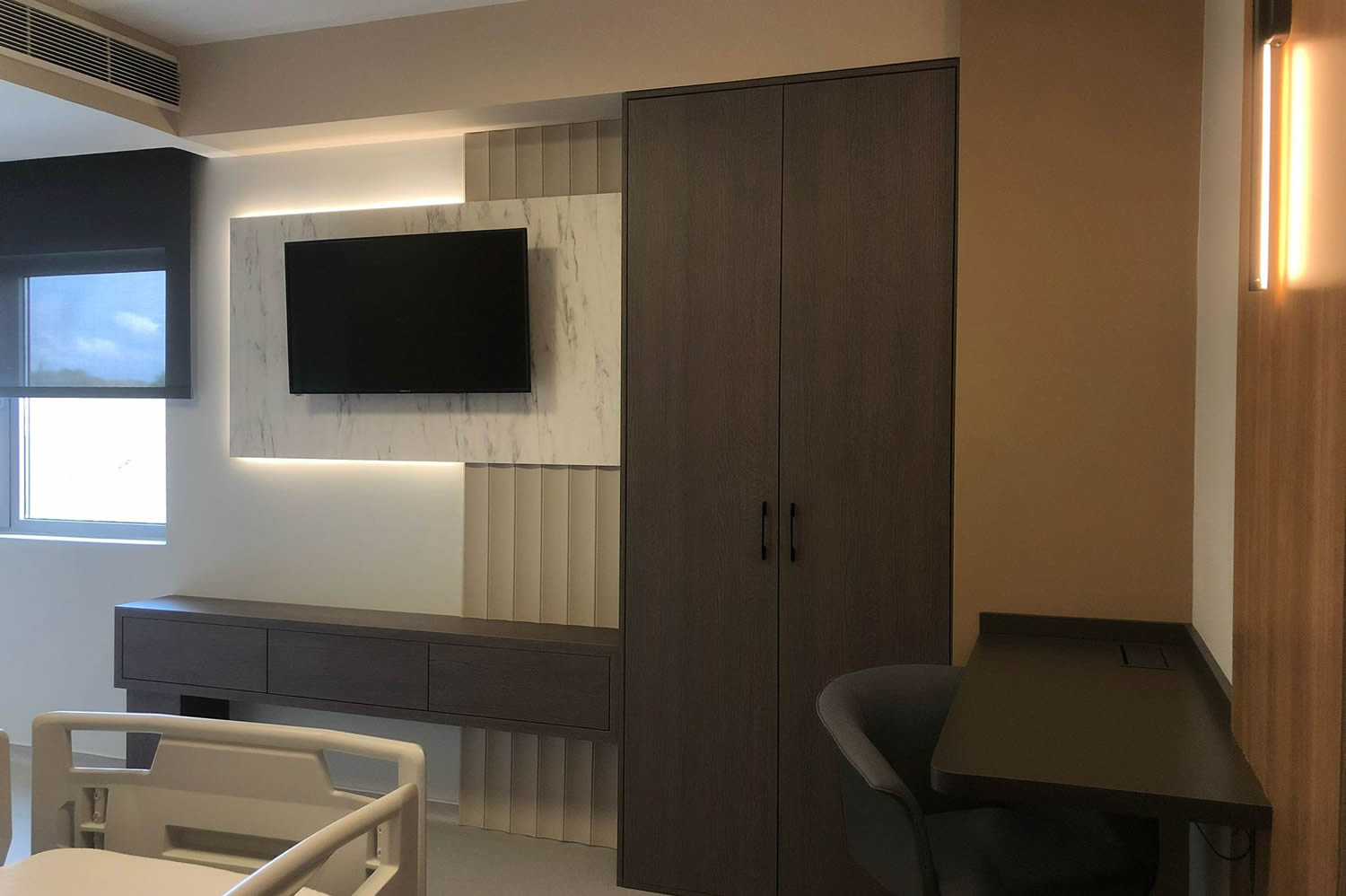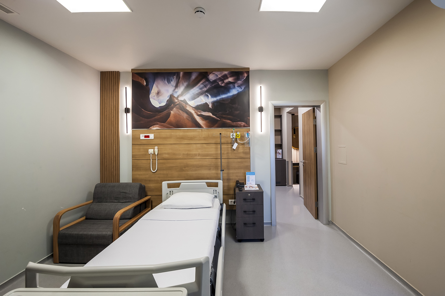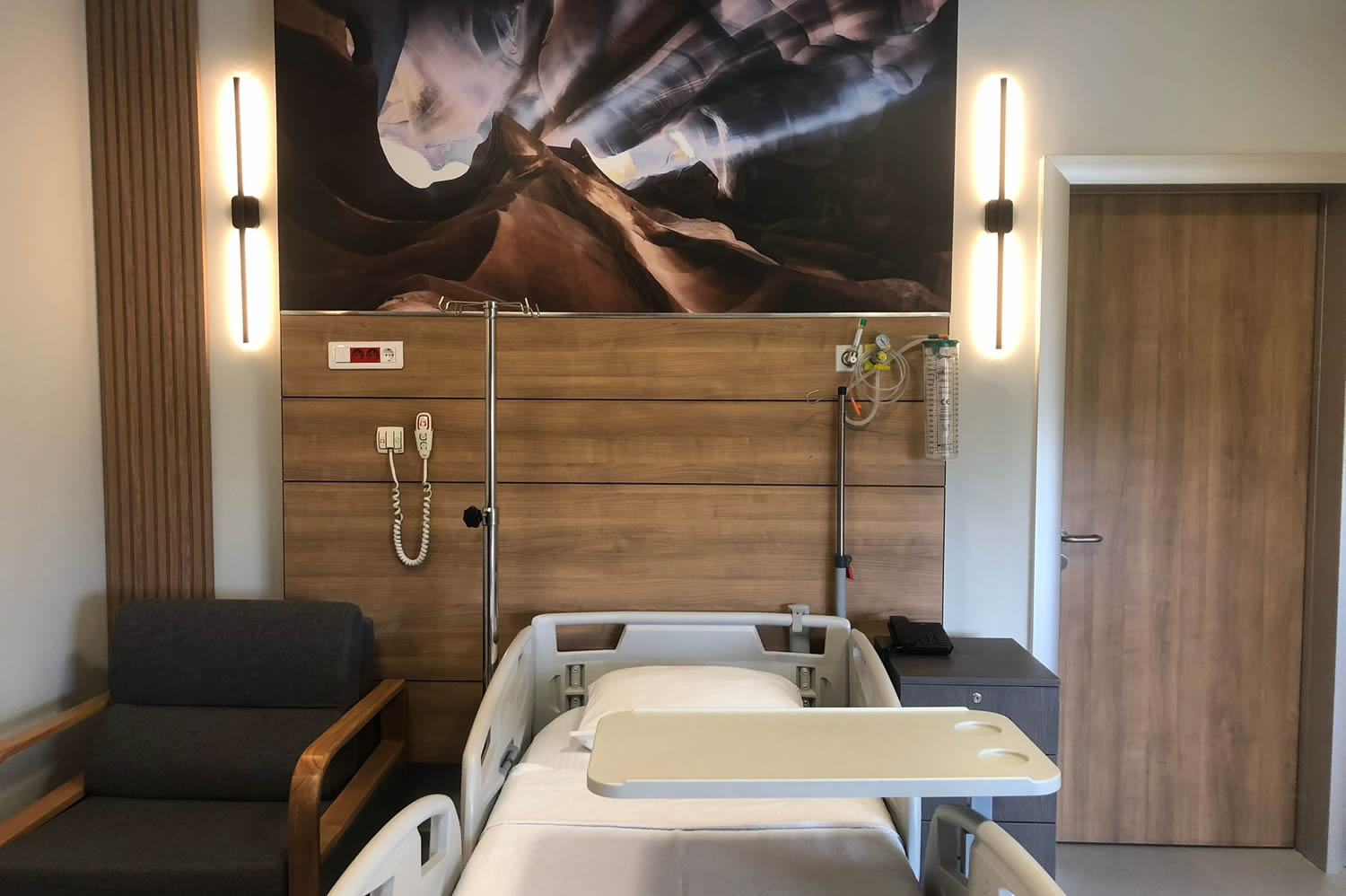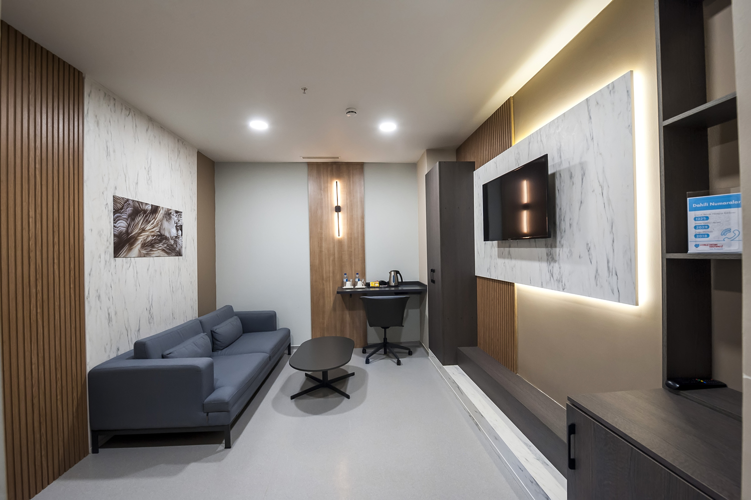 Her bir suit oda, özel tasarım mobilyalarla donatılmış; doğal ahşap dokular, yumuşak tekstiller, depolama sistemleri ve dekoratif aydınlatmalarla estetik bir bütünlük sağlanmıştır. Teknolojik altyapısı sayesinde hastanın tüm ihtiyaçlarına erişim sunulurken, sağlık personelinin de müdahalelerini kolaylaştıran fonksiyonel çözümler entegre edilmiştir. Burası sadece bir tedavi alanı değil, aynı zamanda ruhsal bir dinlenme alanıdır. Tasarımın her noktasında konfor ve prestij hissedilir.