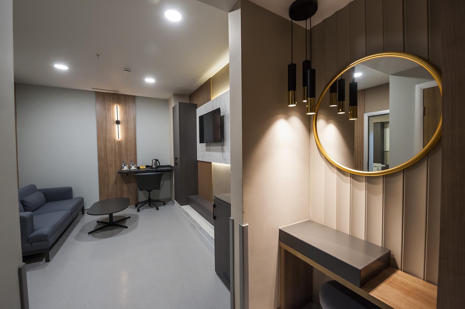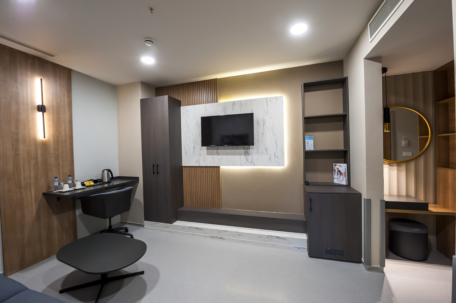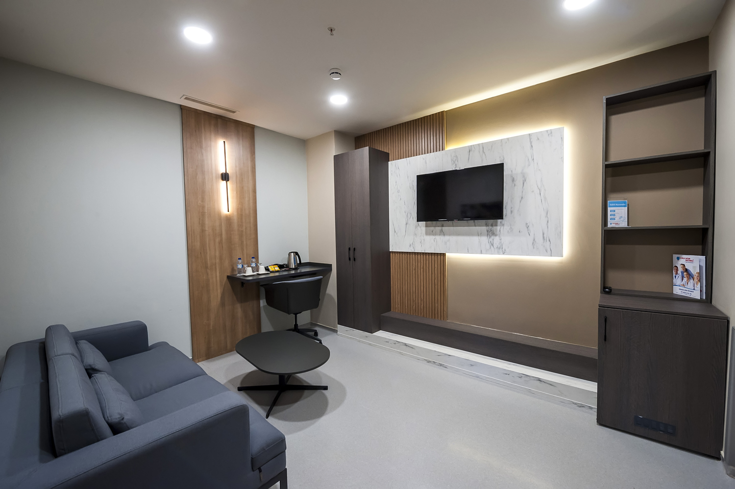 Suit hasta odalarımız, üst düzey konfor arayan hasta ve aileleri için lüks, fonksiyonellik ve mahremiyetin mükemmel dengesini sunar. Bu odalar, adeta bir butik otel odası gibi düşünülerek tasarlanmış, hastane ortamının stresinden uzaklaştıran bir yaşam alanına dönüştürülmüştür. Geniş metrekarelere sahip planlamasıyla hasta alanı, dinlenme bölümü ve refakatçi alanı net biçimde ayrıştırılmıştır.